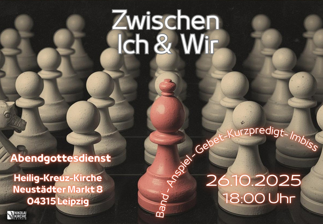 Am Sonntag, dem 26. Oktober, um 18 Uhr, lädt die Jugend der Nikolaigemeinde in die Heilig-Kreuz-Kirche zum Abendgottesdienst ein zum Thema „Zwischen Ich & Wir“