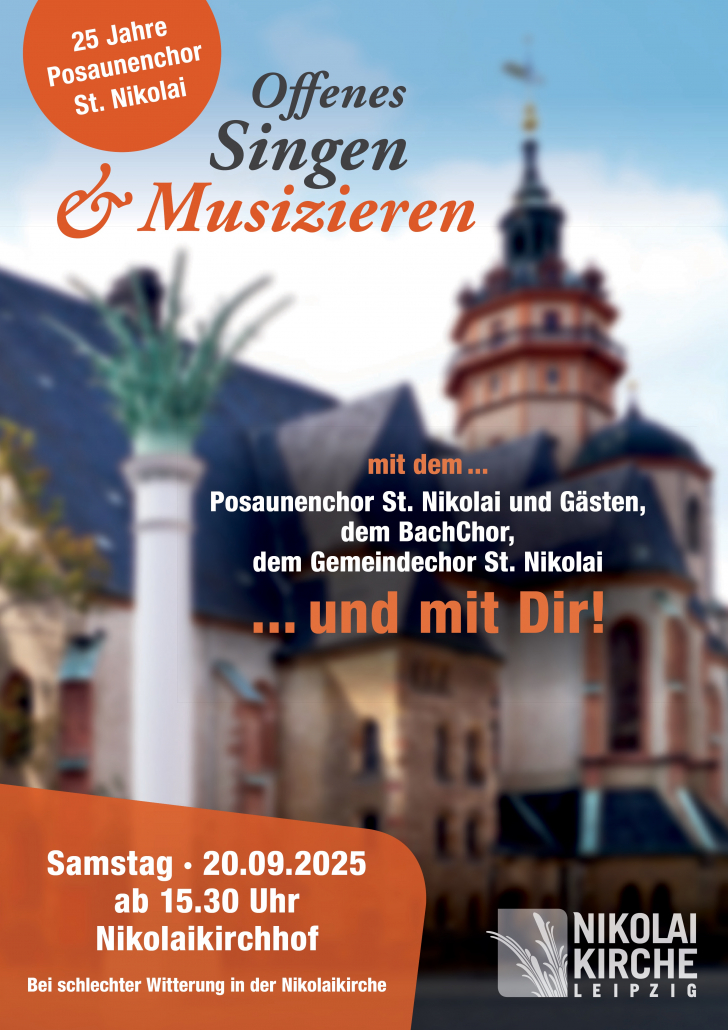 Mit dem Workshop mit Prof. Christian Sprenger und dem Bläsergottesdienst am 30. März 2025 liegt bereits ein Höhepunkt unseres Festjahres hinter uns. Weiter geht es vom 19. bis 21. September 2025. Gemeinsam mit Aktiven, Ehemaligen und Gästen wollen wir unser Jubiläum feiern. Dazu laden wir am 20. September ab 15:30 Uhr zu einem Offenen Singen auf den Nikolaikirchhof ein. Gemeinsam wollen wir mit Stimmen und Instrumenten musizieren und dabei unsere Freude und Dankbarkeit in die Stadt hinaus„posaunen“. Im festlichen Bläsergottesdienst am 21. September um 10 Uhr wollen wir in großer Bläserschar die Nikolaikirche zum Klingen bringen und Gottes Segen für unseren weiteren Dienst erbitten.